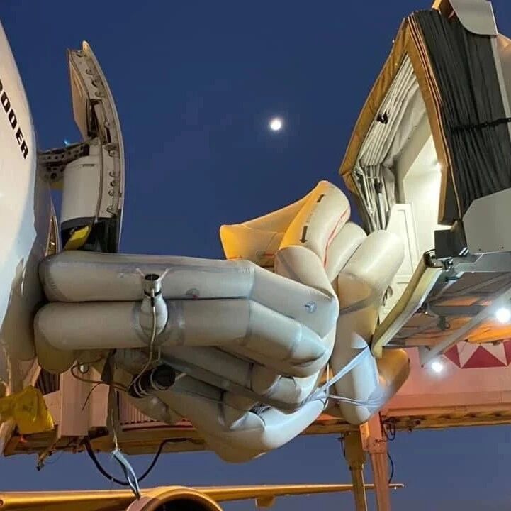 波音777-300ER前登机门滑梯意外放出卡在廊桥上