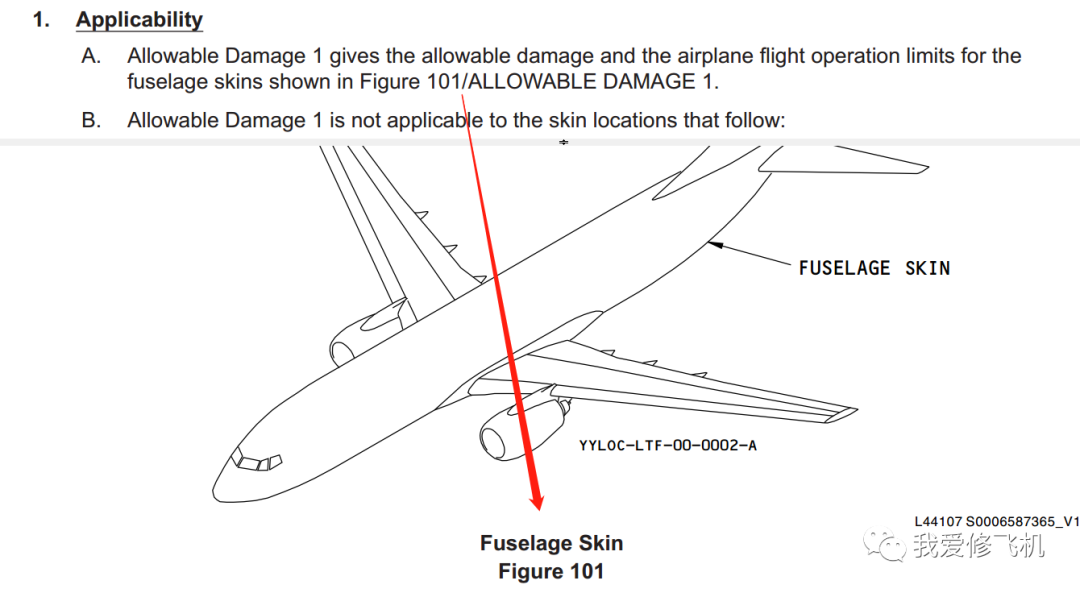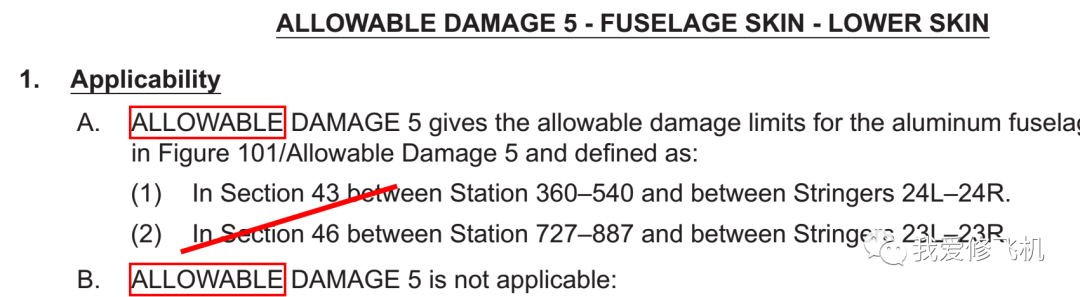 保险起见,我们看看ALLOWABLE DAMAGE 5 适不适用,5只适用于机身段43和46部分区域的损伤。