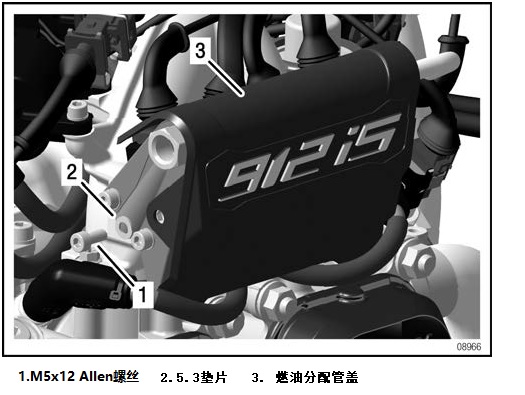 1 | 拧松燃油分配管盖的2个M5x12 Allen螺丝。 |