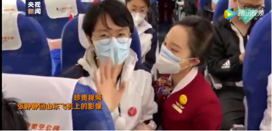 3月21日,支援黄冈的山东医疗队圆满完成救治任务。在返回山东的飞机上,爱笑的张静静说非常想念同事们,她还说:“到济南,离家只有一步之遥。”↓