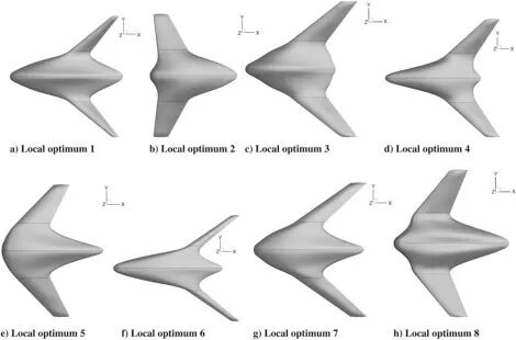 现在的设计主要基于两种最优方案。首先是梯度法(gradient-based methods)。这个方法被广泛运用与航空航天器的设计中,因为它的计算迅速,并且非常适用于针对几何形状变化的优化。在优化仿真中,将飞机模型参数化从而建立目标函数,通过微积分迭代分析对应的梯度,来找到最优解。通过梯度法我们很容易找到局部最优解,但是由于其局限性,我们无法保证它可以确定全局最优点(global optimum)。