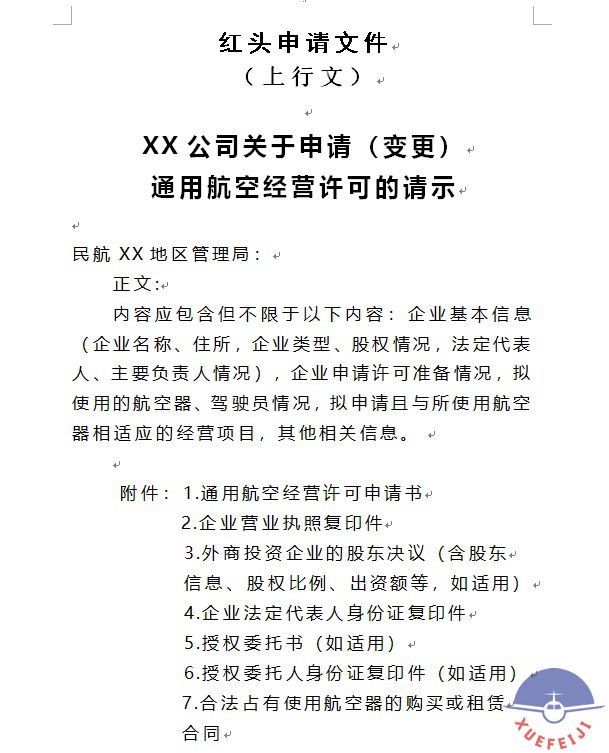 1.通用航空经营许可申请书2.企业营业执照复印件3.外商投资企业的股东决议(含股东信息、股权比例、出资额等,如适用)4.企业法定代表人身份证复印件5.授权委托书(如适用)6.授权委托人身份证复印件(如适用)7.合法..