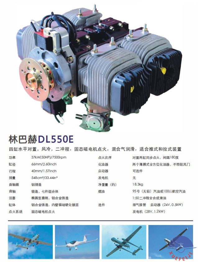 四缸水平对置,风冷, 二冲程,固态磁电机点火,混合气润滑,适合推式和拉式装置